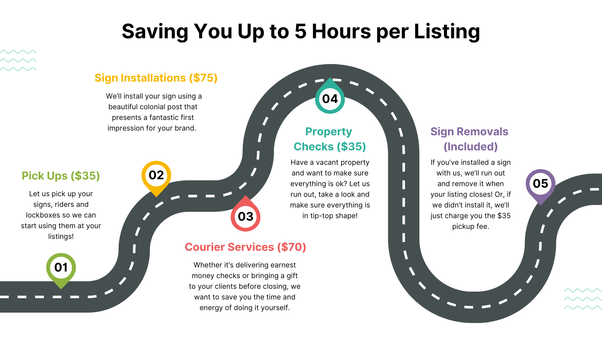 We've got you covered across the Carolinas! We charge a flat fee of $75 per listing and we install in 48 hours or less. Most other companies will charge you storage costs, distance fees, and renewal payments. We don't charge you any of that. The only time there's an additional $35 charge is if you need us to make an additional trip to pick up your signs or change out a rider. Make sure to choose "Install Now NC" as your installer when placing an order. The FAQs and How-to Guides on the bottom of the "Get Started" page will give you everything you need to know.